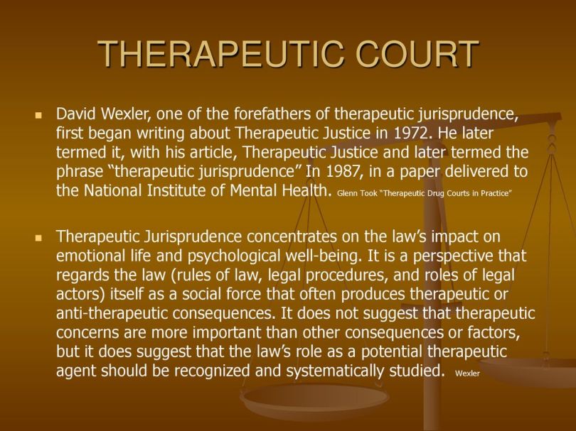 David Wexler, one of the forefathers of therapeutic jurisprudence, first began writing about Therapeutic Justice in He later termed it, with his article, Therapeutic Justice and later termed the phrase therapeutic jurisprudence In 1987, in a paper delivered to the National Institute of Mental Health. Glenn Took Therapeutic Drug Courts in Practice Therapeutic Jurisprudence concentrates on the law’s impact on emotional life and psychological well-being. It is a perspective that regards the law (rules of law, legal procedures, and roles of legal actors) itself as a social force that often produces therapeutic or anti-therapeutic consequences. It does not suggest that therapeutic concerns are more important than other consequences or factors, but it does suggest that the law’s role as a potential therapeutic agent should be recognized and systematically studied. Wexler.